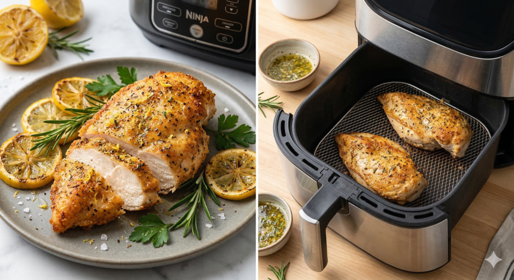 This Air Fryer Crispy Lemon Herb Chicken Breast recipe combines bright citrus flavour, aromatic herbs, and perfectly juicy chicken with minimal effort. The air fryer’s convection heat produces a crisp exterior while keeping the inside tender.